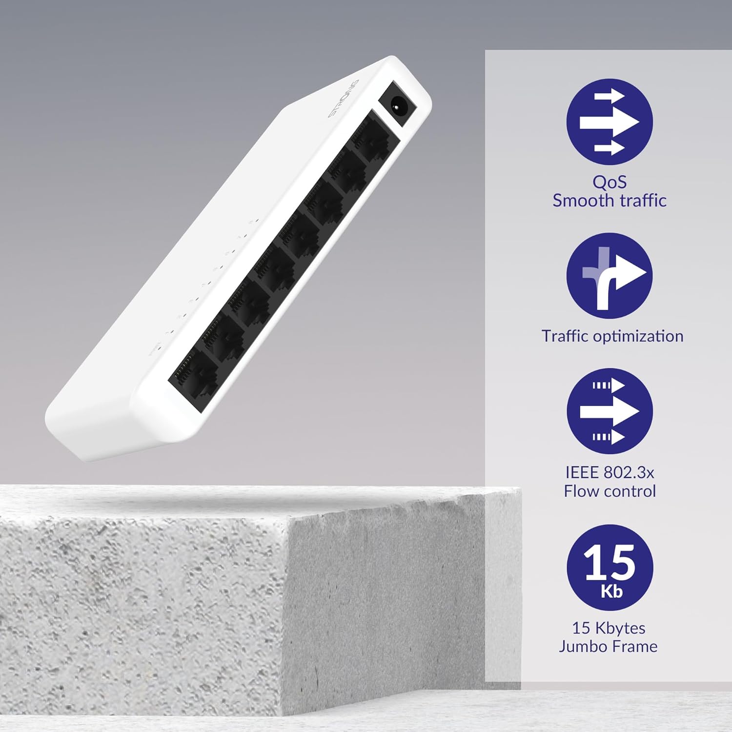 Il design senza ventola delle 8 porte di Switch garantisce un funzionamento silenzioso. Grazie alle molteplici opzioni di montaggio, è possibile scegliere tra il montaggio su scrivania o a parete. È sufficiente collegare i dispositivi e il gioco è fatto.